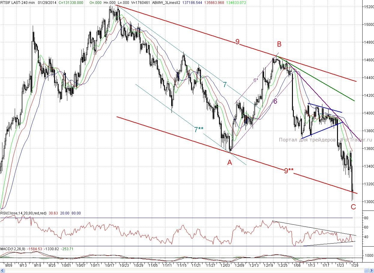 Если рассмотреть фьючерс на индекс РТС, то вчера на основной сессии котировки достигли расчетной цели падения ~130 000 п. про которую было написано еще в понедельник, после того как котировки преодолли декабрьский минимум А (135 530 п.) Но это при условии, что длина волны А равна длине волны С. Если же будет расширение 1,62, то тогда еще падать и падать. Но и здесь по техническим индикаторам образовались бычьи дивергенции. Так что, по крайней мере, и здесь отскок созрел.