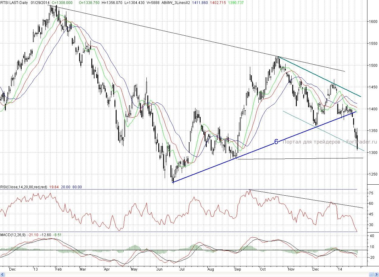 А на долларовом РТС, за счет резкого ослабления рубля события уже давно идут под медвежью диктовку. Здесь основной поддержкой выступает минимум начала сентября 2013 года (1 285,26 п.)