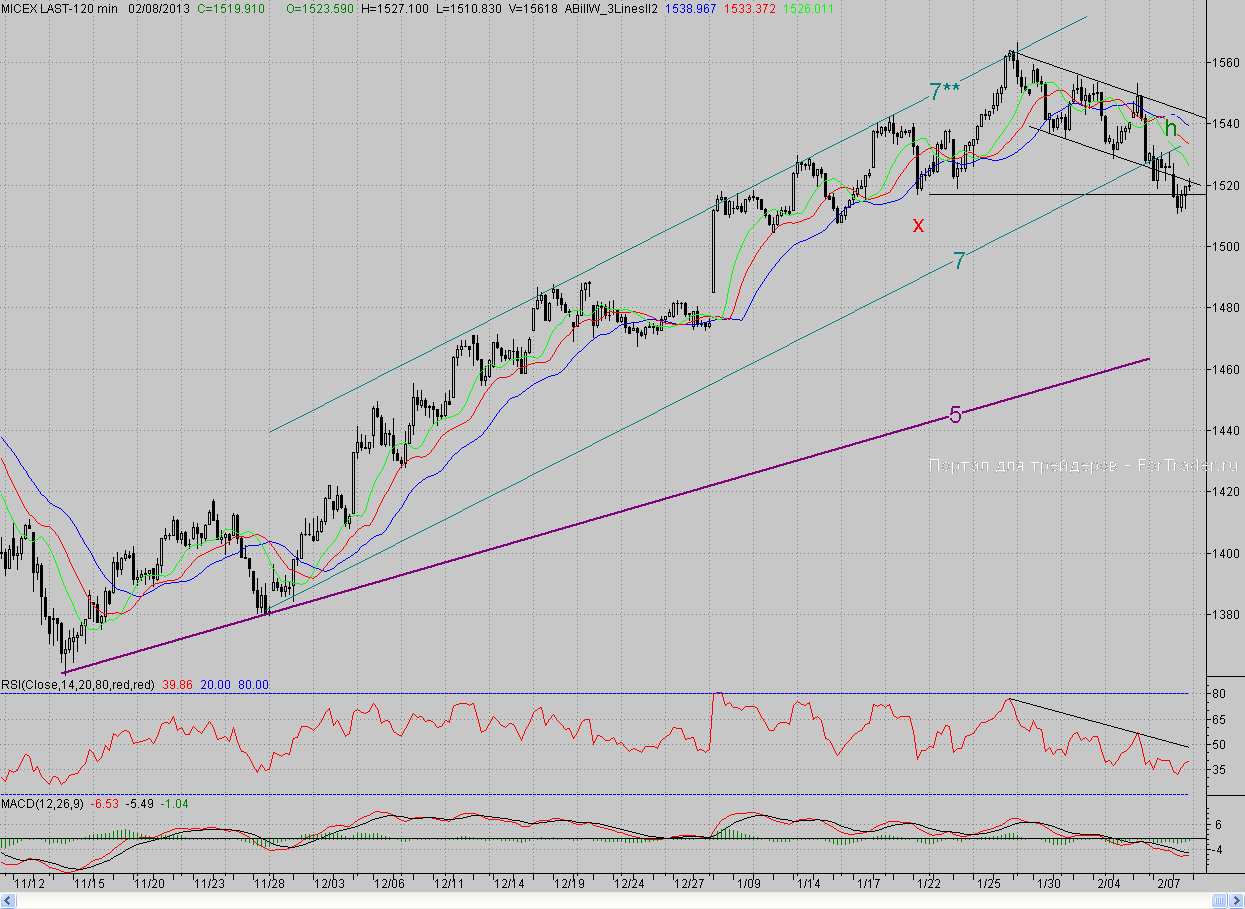 Исследуя 2-часовой график индекса ММВБ, видим, что открывшись с небольшим гэпом вниз, котировки возобновили снижение и преодолели не только нижнюю грань флага, но и более серьёзный редут «бычьей» обороны в лице дневного фрактала на продажу Х (1517 п.). И казалось, что путь на Юг «медведям» открыт. Однако «быки», понимая, чем им грозит сдача этого важного рубежа, собрались с силами и остановили наступление «бурых», а ближе к вечеру на фоне позитивно открывшихся американских рынков и вовсе начали бодаться и сумели отвоевать фрактал Х и даже нижнюю грань флага. Правда, полностью отыграть утренние потери им не удалось, и день закрылся в небольшом минусе.