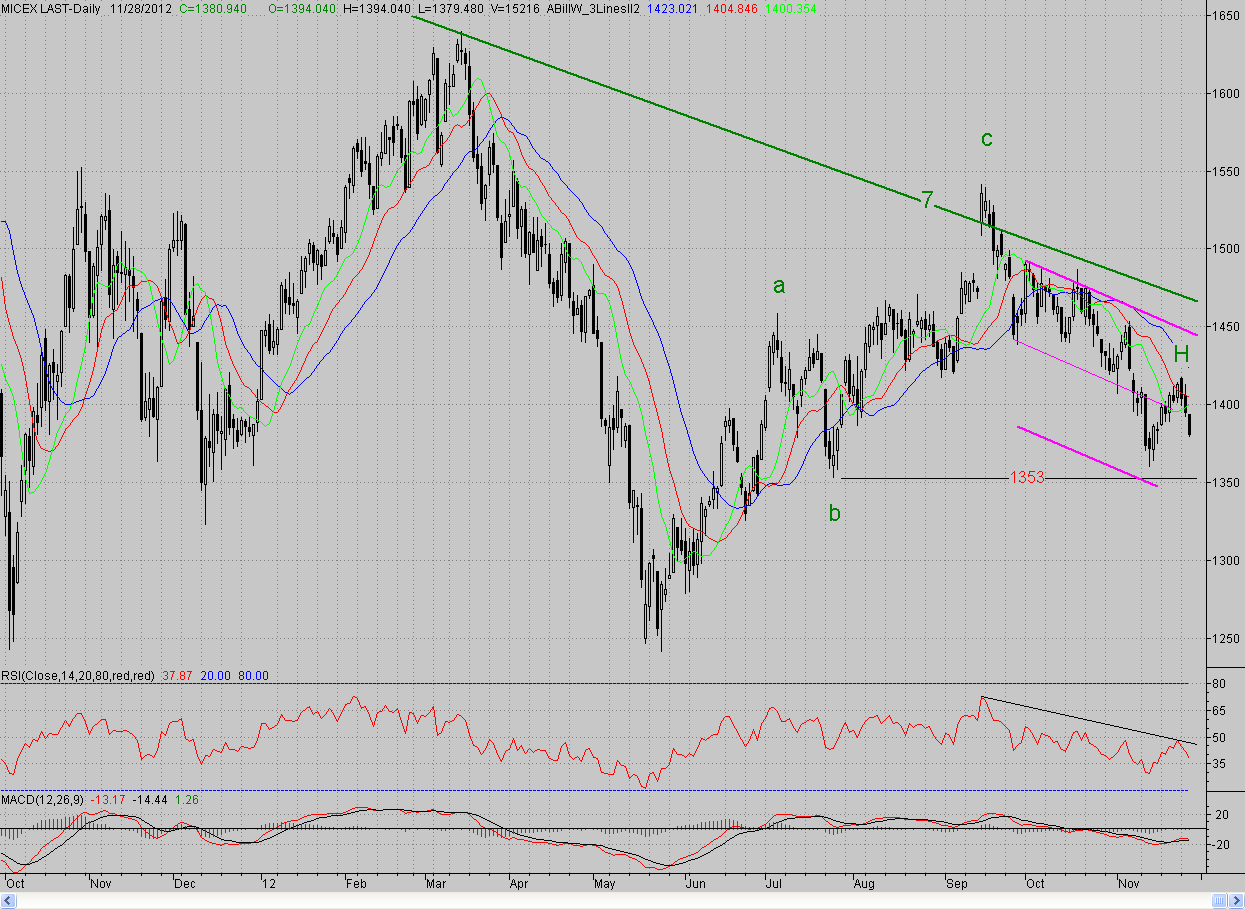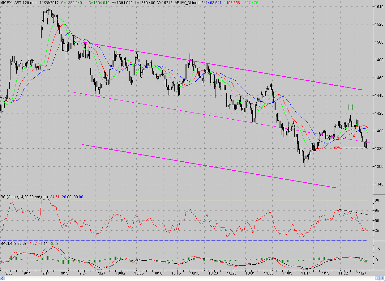 Исследуя 2-часовой график индекса ММВБ, видим, что открывшись с небольшим гэпом вниз, котировки продолжили снижение. На непродолжительное время кластерная зона поддержки (средняя линия падающего канала, а также предыдущий локальный минимум (1389,1 п.) и уровень 50%-ной коррекции от роста с середины ноября) сдерживала наступательный порыв медведей. Но после полудня данный редут был преодолен, и цены пошли ниже. Поддержку котировки встретили только в районе 62% коррекции. От данного уровня быки попытались контратаковать, однако значимого успеха не добились. А ближе к окончанию сессии медведи усилили прессинг, и цены протестировали дневной минимум. В результате закрытие произошло вблизи него.