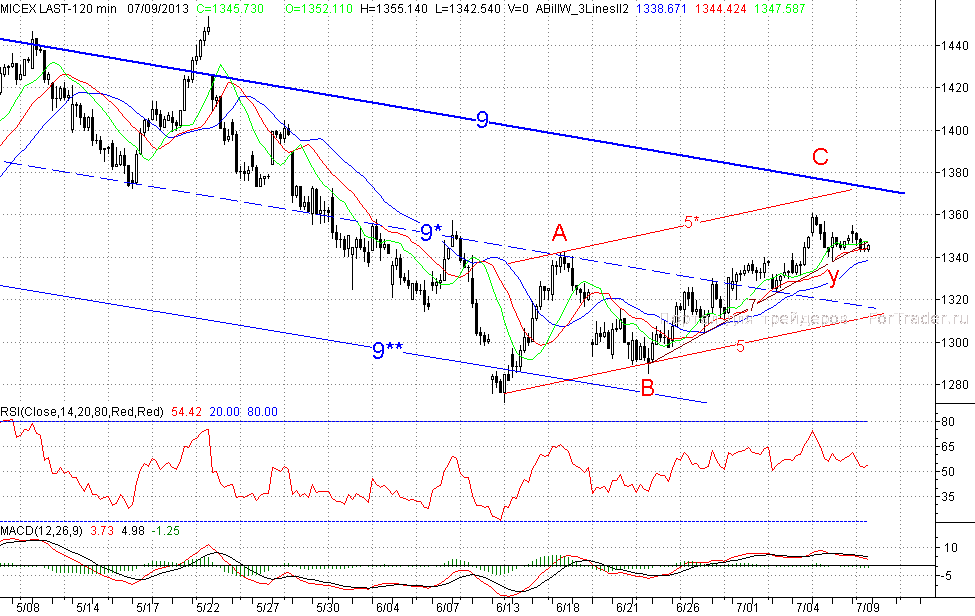 Так что сейчас у покупателей остаются все шансы на возобновление отскока, начавшегося почти месяц назад. В этом случае роль ближайшего сопротивления сыграет вчерашний максимум (1355,1 п.), основным остаётся среднесрочный падающий тренд (9) (1365-1370 пп.). Кстати, за последние 3,5 сессии сформировался небольшой «треугольник», и если он разрядится наверх, то целью этого роста будет район как раз 1370 п. Так что сегодня мы увидим либо сжатие этой пружины до предела, либо уже выход из «треугольника».