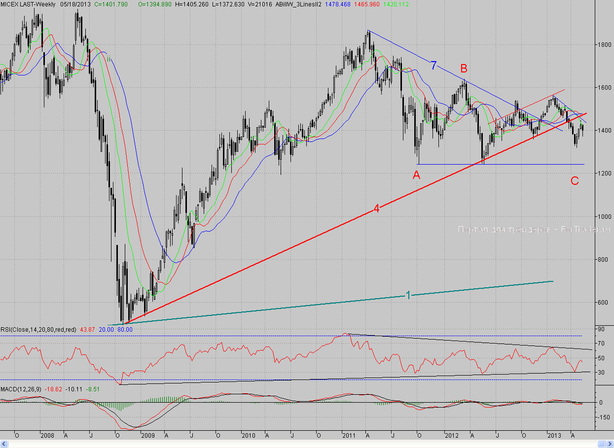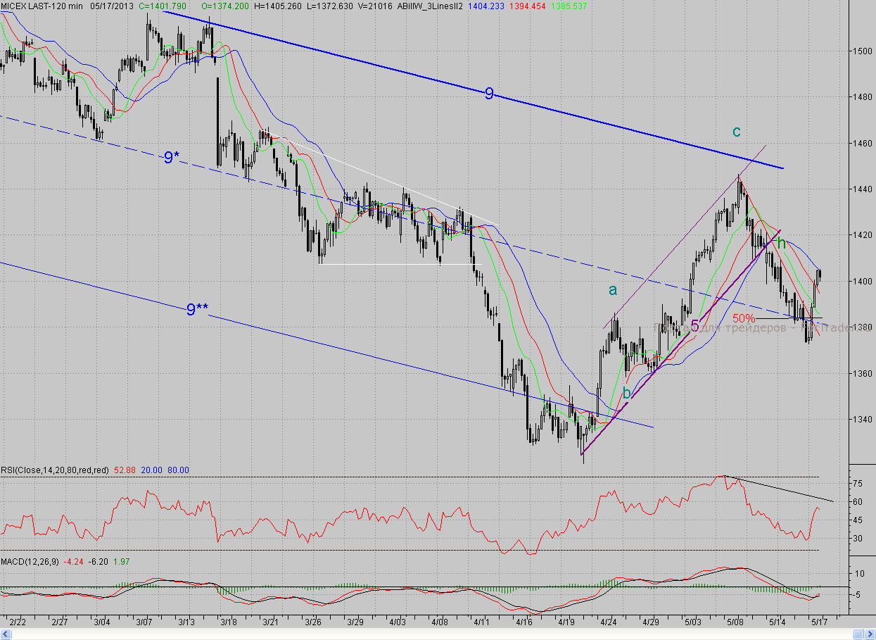 Исследуя 2-часовой график индекса ММВБ, видим, что открывшись на тех же уровнях, котировки до обеда торговались в боковике, словно собирались с силами. И действительно после часа дня «быки» как по команде пошли в контрнаступление по всем фронтам. В результате к двум часам дня цены уверенно преодолели не только ближайшее сопротивление в лице краткосрочного падающего тренда, но и кластерную зону сопротивления, в которой проходила средняя линия (9*) среднесрочного падающего канала (9-9**) и находился уровень 50%-ной коррекции от трёхнедельного роста (1383 п.). Однако на этом покупатели решили не останавливаться, благо внешняя конъюнктура в лице подрастающих фьючерсов на американские индексы и дорожающей нефти позволяла продолжать наступление. В итоге котировки преодолели и уровень 38%-ной коррекции от снижения с 10 мая, и только под самый занавес прошла небольшая фиксация прибыли. Тем не менее, день завершился в хорошем плюсе.