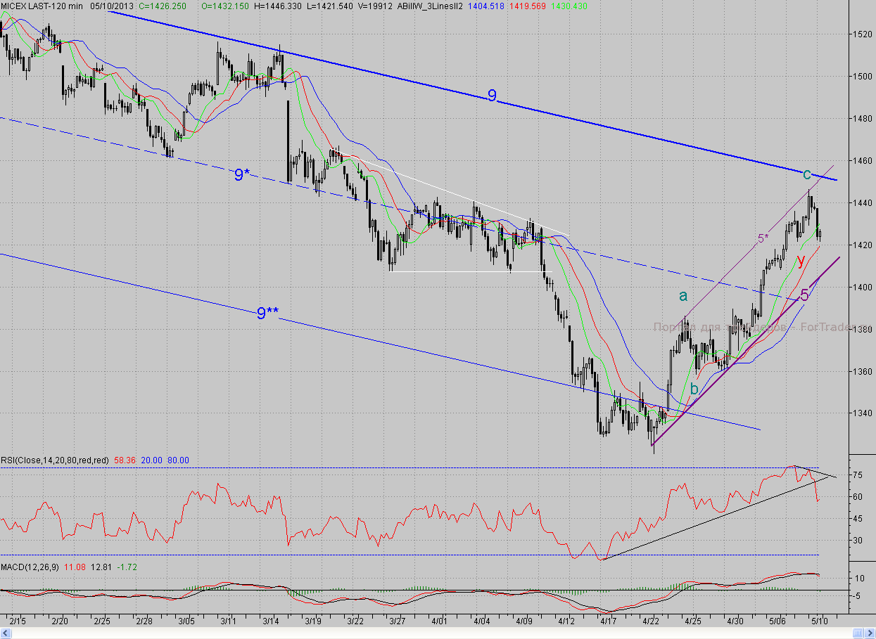 Таким образом, на отскоке цены достигли промежуточной цели роста в лице верхней границы канала (5-5*), кстати, здесь же находится и уровень 62%-ной коррекции от падения с середины марта. Однако удержать завоёванное «быкам» не удалось. Минусом для покупателей является и то, что на 2-часовом графике образовались полноценные медвежьи дивергенции. При этом «быкам» надо помнить, что завтра особый день – сегодня отсечка у трёх «тяжёлеловесных» акций (Газпром, ЛУКОЙЛ, ВТБ), а также у Татнефти и Квадры. И учитывая дивиденды, это может с открытия рынка во вторник дать сразу минус больше 1%. Так что и этот фактор будет играть за продавцов. И ближайшей поддержкой станет фрактал Y, а более значимой – предыдущий локальный минимум (1408 п.) и краткосрочный растущий тренд (5).