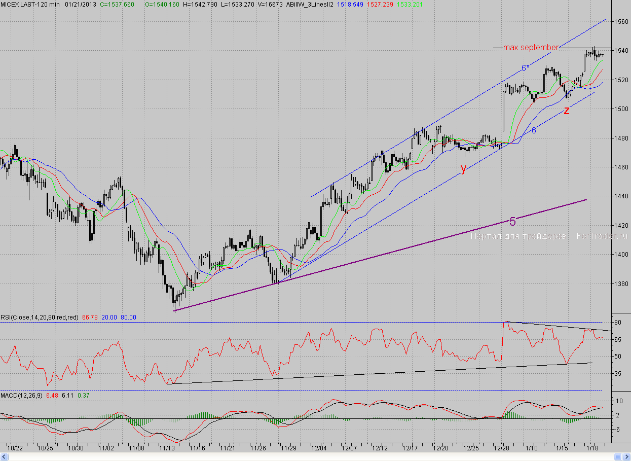 В случае снижения роль ближайшей поддержки сыграет вчерашний минимум, он же новый 2-часовой фрактал на продажу (1533,3 п.), но пока недействительный, а далее – незакрытое окно пятницы. Ниже проходит и среднесрочный растущий тренд (6). Однако отдохнувшие вчера покупатели могут и продолжить наступление (ведь полуторадневную проторговку можно рассматривать как «бычью полку»). В этом случае в роли ближайшего сопротивления выступит вчерашний максимум (1542,8 п.), а при его уверенном преодолении – верхняя граница растущего канала (6-6*), которая уходит всё выше и выше.