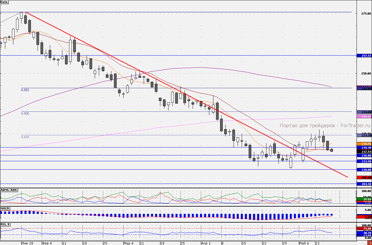 Акции «Роснефти» в первой половине сессии ушли ниже 21- дневной скользящей средней – 218,02 руб. Закрепление ниже данной отметки позволит «медведям» увести акций к следующей цели, в район 216,00 руб. Судя по показаниям трендовых индикаторов, в дальнейшем снижение котировок может быть продолжено. Индикатор ADMI/ADX показывает, что преимущество находится на стороне продавцов (линия «быков» находится ниже линии «медведей»), при этом гистограмма MACD (12;26;9) вновь растет на положительной территории. При приближении к отметке 216,00 руб. «шорты» все же стоит сокращать, так как позитивные ожидания статистики из США могут сдержать продавцов от более активных действий. Наш 30-минутный торговый робот удерживает короткие позиции от отметки 220,85 руб.