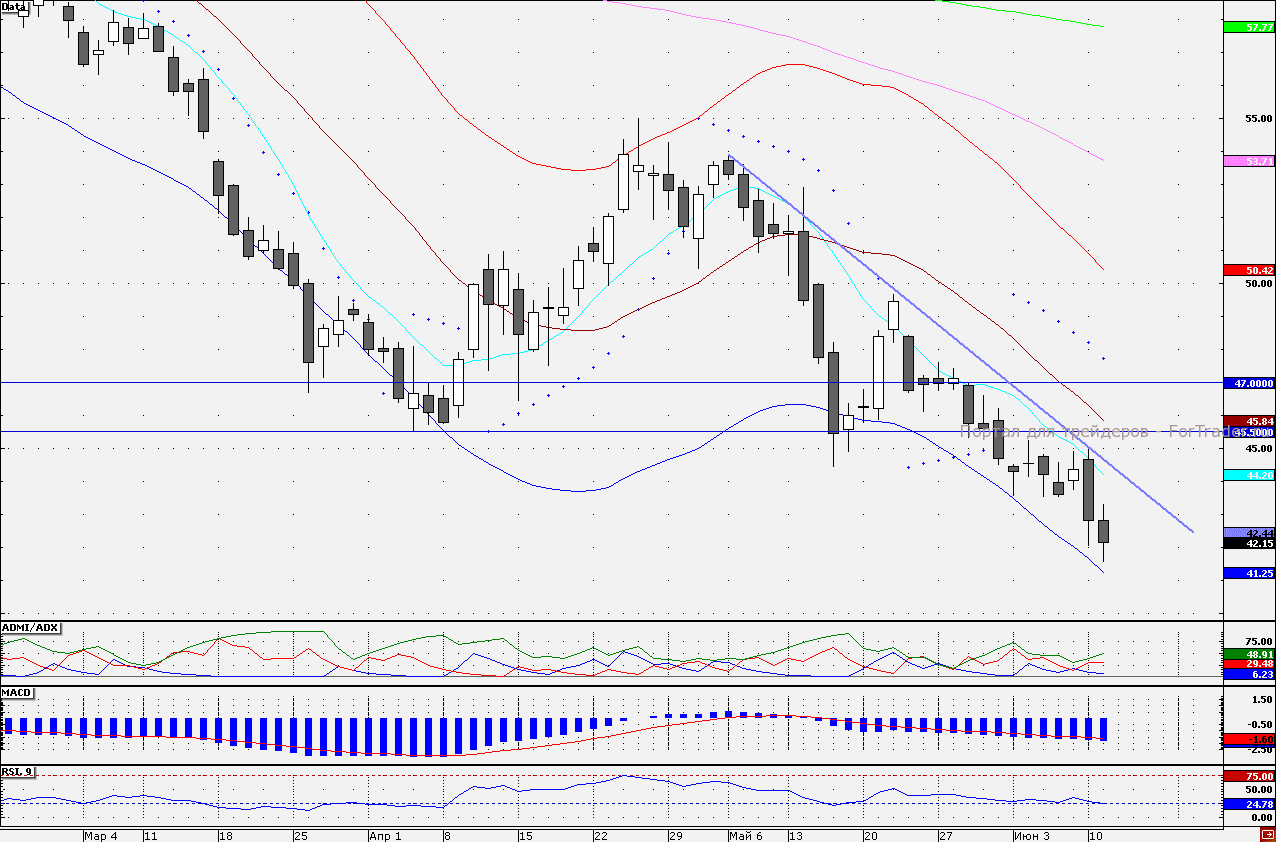 Акции НЛМК с начала мая торгуются в нисходящем тренде. Так накануне линия нисходящего тренда, проходящая чуть выше 45 руб., в очередной раз отразила атаку «быков». Сегодня акции продолжили снижения от данного сопротивления. Показания трендовых индикаторов пока указывают на сохранении преимущества на стороне продавцов. В частности, линия «медведей» индикатора ADMI/ADX находится выше линии «быков». Однако график индикатора RSI (9) достиг зоны перепроданности, при этом акции приблизились к нижней границе трендового индикатора Envelope – 41,25 руб., после тестирования которой обычно следует отскок вверх. Таким образом, при приближении к отметке 41,25 руб. короткие позиции по бумагам стоит сокращать. Наш 30- минутный торговый робот находится в «шортах», удерживая короткие позиции от отметки 44,18 руб., но при улучшении настроений готов перевернуться.