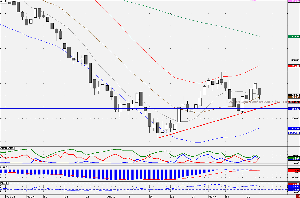 На фоне сегодняшнего оглашения слабой статистики из Китая в лидерах падения числятся акции металлургического сектора, в частности акции «Северстали». Под давлением внешнего фона в первой половине дня бумаги уходили ниже 10- и 21-дневных скользящих средних (270,13 руб. и 268,35 руб. соответственно). Закрепление акций ниже столь значительных поддержек укрепило бы позиции «медведей». Пока показания трендовых индикаторов не дают четких сигналов. Если индикатор ADMI/ADX показывает, что преимущество переходит на сторону продавцов (линия «медведей» снизу вверх пересекается с «быков»), то сигнальная линия MACD (12;26;9) по-прежнему стремится в район нулевого значения, что является позитивным сигналом для покупателей. Таким образом, я бы не рекомендовала удерживать короткие позиции по бумагам. Инвесторам более склонным к риску наращивать короткие позиции стоит только после уверенного закрепления акций ниже важных поддержек. При развитии негативного сценария следующей целью для акций выступит линия восходящего тренда – 258,60 руб., актуального с середины апреля текущего года. Наш 30-минутный торговый робот пока удерживает короткие позиции от отметки 275,90 руб.