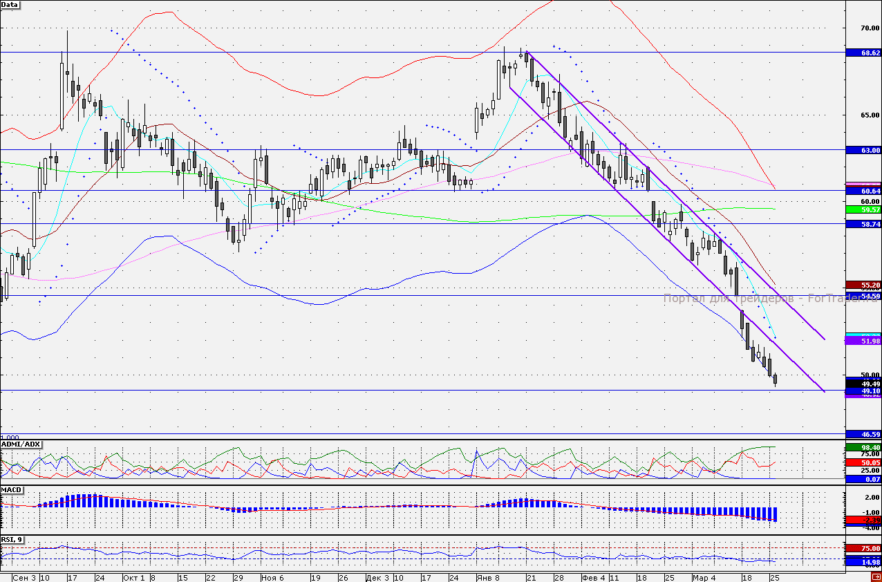 Акции НЛМК сегодня пробили вниз психологическую отметку 50 руб. Ближайшей поддержкой для акций выступает уровень 49,10 руб., оказывавшей поддержку бумагам в мае прошлого года. При закреплении акций ниже данного уровня целью для снижения выступит минимум мая прошлого года – 46,59 руб. Судя по техническим сигналам, преимущество сохраняется на стороне продавцов. Индикатор ADMI/ADX показывает, что силы «медведей» по бумагам преобладают (линия «медведей» находится» выше линии «быков»), при этом график индикатора MACD (12;26;9) по-прежнему находится на отрицательной территории. Однако с удерживанием коротких позиций стоит быть осторожными, поскольку бумаги достигли нижней границы индикатора Envelope, а также сильно перепроданы, в связи с чем «быки» в любой момент готовы перехватить инициативу. Таким образом, при приближении к ближайшей поддержке 49,10 руб. «шорты» стоит сокращать. Наш 30-минутный торговый робот открыл короткие позиции от отметки 50,66 руб.