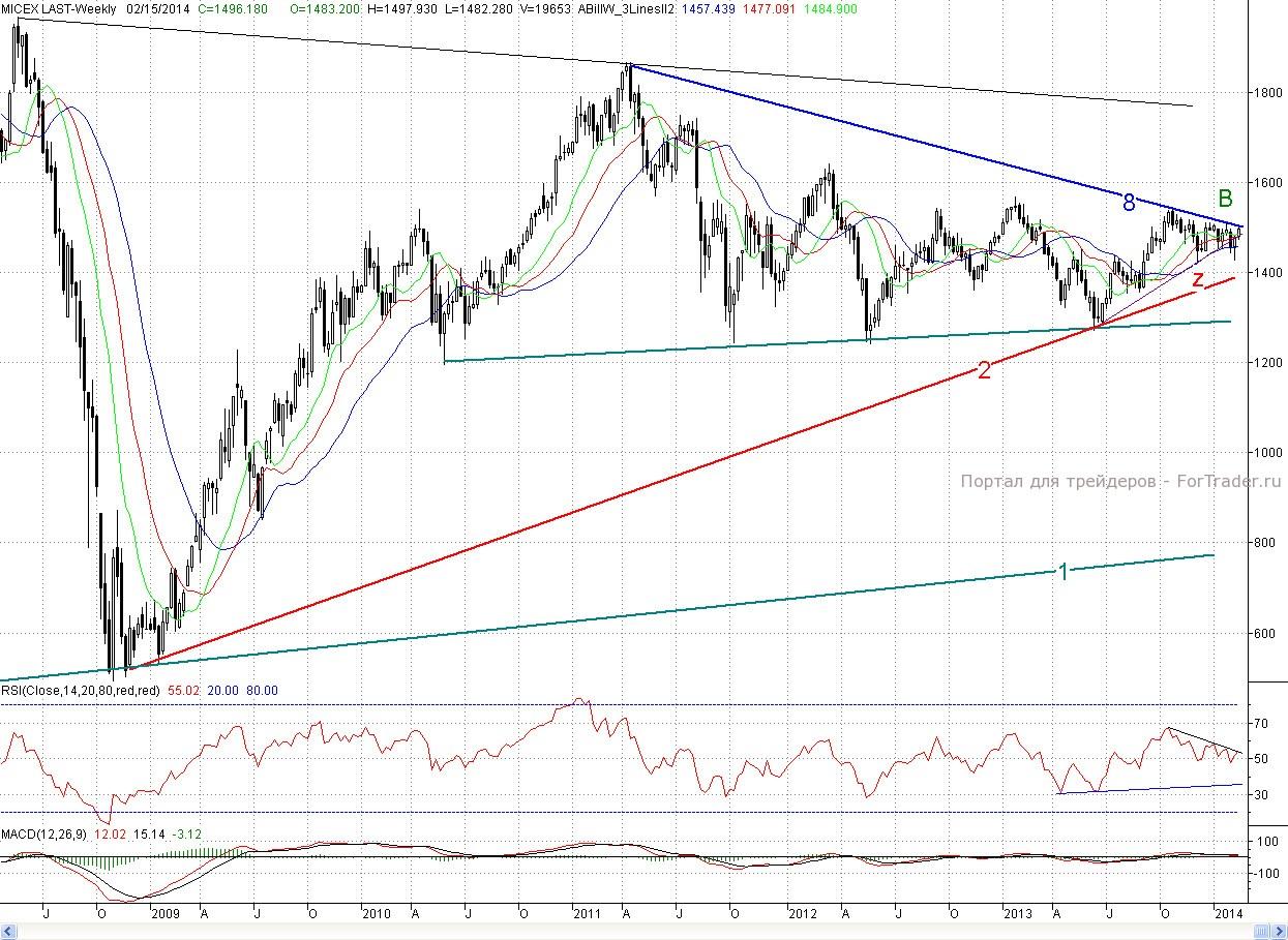 Сегодня на позитивном внешнем фоне быки попытаются закрепить пятничный успех. Долгосрочный растущий тренд (8) будет пройден сразу с открытия, но на помощь медведям придет следующий сильный оборонительный редут в лице района предыдущих локальных максимумов, одним из которых является недельный фрактал на покупку В (1 511,69 п.). В пятницу мы писали, что покупатели еще достаточно сильны, и попытки снова затащить котировки наверх будут предприниматься. А вот хватит ли им сил уверенно преодолеть вышеназванный рубеж еще вопрос. Хотя на сегодняшней не торгующей Америке и эта задача быкам также может оказаться по силам. Тем не менее, игрокам на повышение надо проявлять повышенную бдительность, так как рост, происходящий практически без коррекции, как правило, заканчивается печально для покупателей.