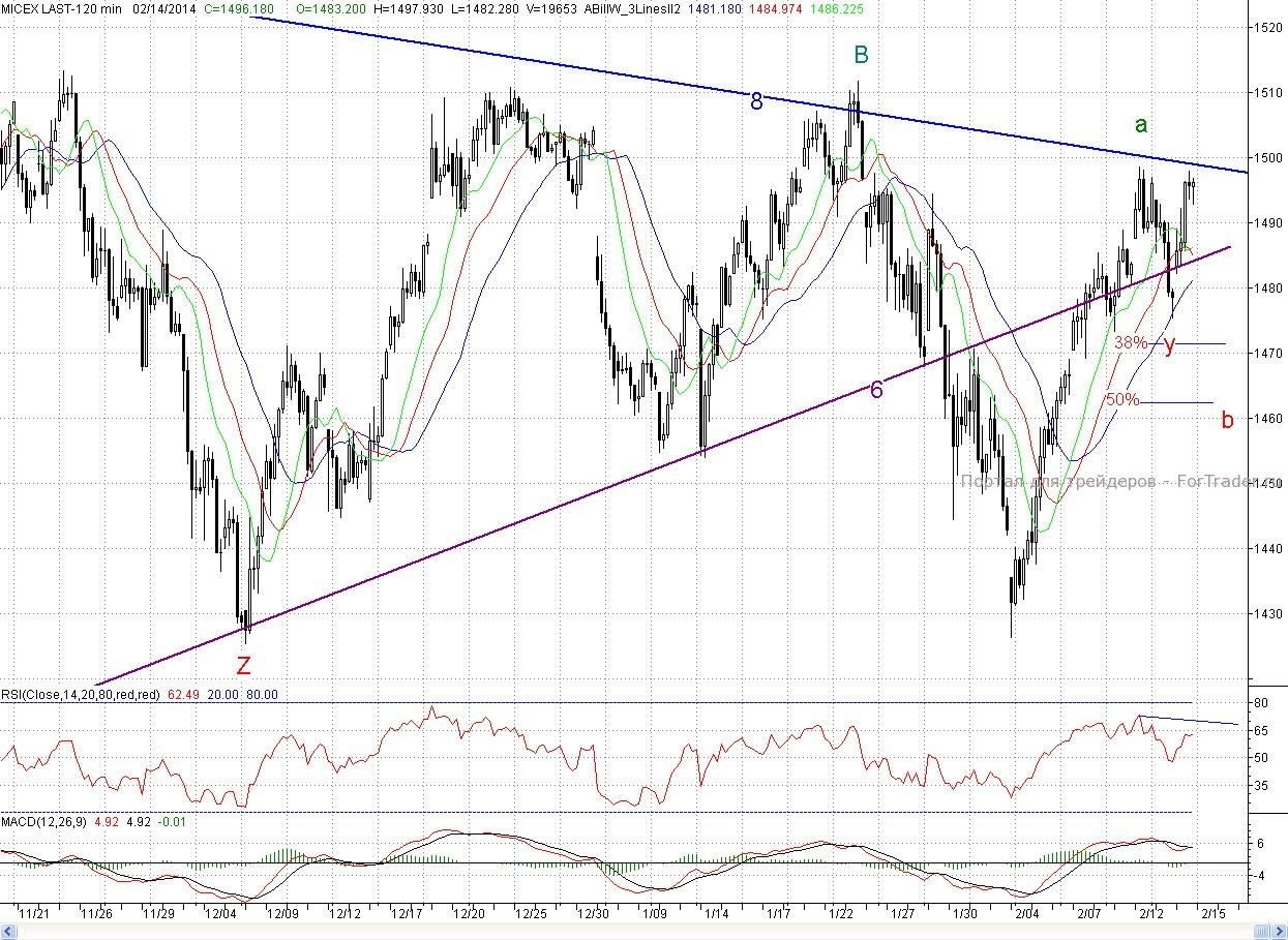 Исследуя 2-часовой график индекса ММВБ видим, что открывшись с гэпом вверх, котировки сразу же оказались выше ближайшего сопротивления (среднесрочный растущий тренд (6)). Но дальнейшего роста сразу не последовало, и медведи попытались скинуть быков с завоеванного плацдарма. Однако покупатели выстояли, а после обеда они перешли к решительным действиям. В результате цены рванули вверх, лишь немного не дойдя до максимума среды А (1 498,62 п.) и долгосрочного растущего тренда (8), и закрытие произошло в хорошем плюсе (1,19%)