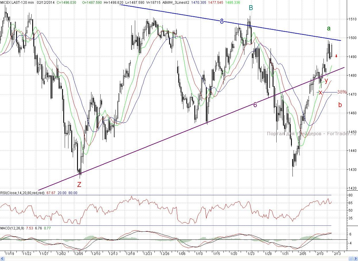 Исследуя 2-часовой график индекса ММВБ видим, что на позитивном внешнем фоне, открывшись с гэпом вверх котировки уверенно преодолели максимум вторника (1 488,94 п.) и продолжили рост. Взоры быков были устремлены на долгосрочный падающий тренд (8) (~1 500 п.), начинающийся с апреля 2011 года. И к обеду они вплотную подошли к вышеназванному рубежу, от которого начались продажи. Однако они были неагрессивные, и котировки не смогли закрыть и утреннего окна. А ближе к окончанию сессии быки снова пошли в наступление, но покорить тренд (6) снова не сумели. Тем, не менее, день завершился в хорошем плюсе (0,84%).