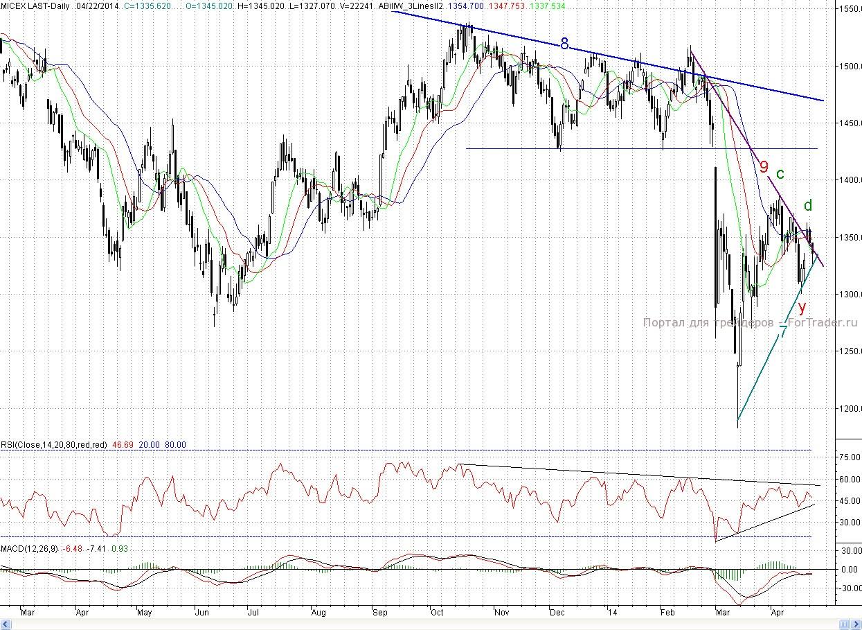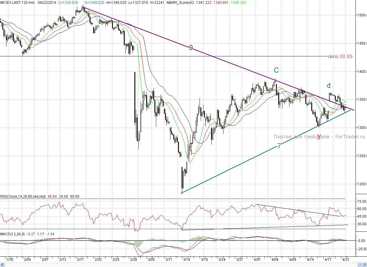Исследуя 2-часовой график индекса ММВБ видим, что сразу с открытия медведи начали продавить котировки. Ближайшая поддержка на уровне 38% коррекции от трехдневного роста (~1 340 п.) была уверенно преодолена. Но медведи решили на этом не останавливаться и, продолжив давление, закрыли пятничное окно. Только в районе среднесрочного растущего тренда (7) цены нащупали поддержку. От данного уровня прошли покупки. Тем не менее, день завершился в минусе (0,7%).
