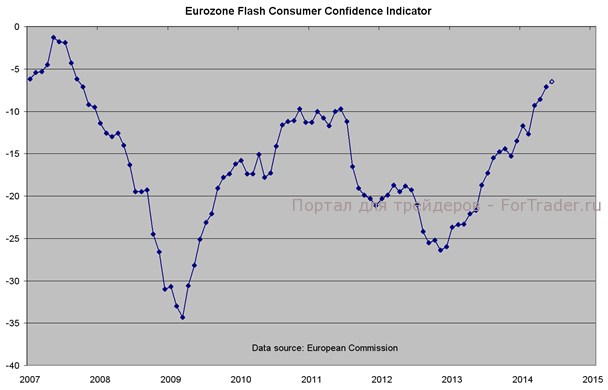 Согласно ожиданиям, индекс потребительского доверия в Еврозоне в июне улучшился до -6,5 по сравнению со значением -7,1 в мае. Уровень оптимизма среди потребителей непрерывно рос с того момента, когда председатель ЕЦБ Марио Драги пообещал в 2012 году сделать «все возможное» и европейский кризис перестал быть самой обсуждаемой темой. В деловом секторе доверие также повысилось, но темпы улучшения здесь были более сдержанными, а реальный экономический рост — едва заметным.