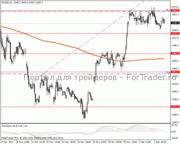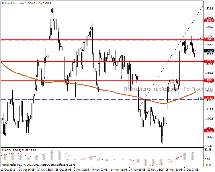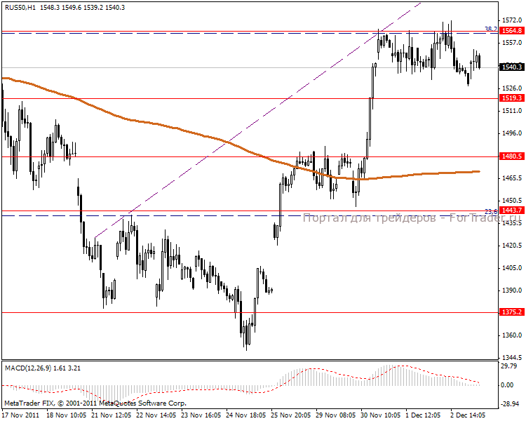 Торговая рекомендация – входим в рынок на продажу после пересечения сильной линии сопротивления в 1564 пункта.