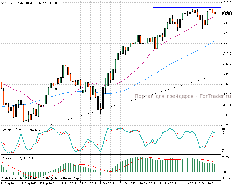 Индекс S&P 500 вновь вернулся к росту, но цена не смогла с первого раза пробить недавно установленный максимум на отметке 1812,2. О начале технической коррекции свидетельствуют также показания MACD и стохастика (начал выход из зоны перекупленности).