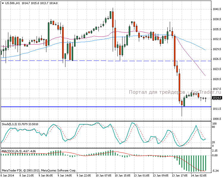 На часовом графике видно, что падение за вчерашний день составило более 250 пунктов. В данный момент цена консолидировалась в диапазоне 1812,0-1816,0. При этом скользящие средние имеют нисходящее направление, а MACD указывает на возможное начало коррекционного движения.