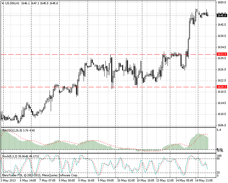 На часовом графике наблюдаем уверенную восходящую тенденцию, на данный момент индекс торгуется на исторически рекордных уровнях — вблизи отметки 1646,0. Часовой индикатор MACD сменил рост на падение, пересек сигнальную линию, но все еще находится далеко в положительной области, по-этому о переходе в коррекционную фазу говорить преждевременно. Стохастический осциллятор разгрузился и вышел из зоны перекупленности.