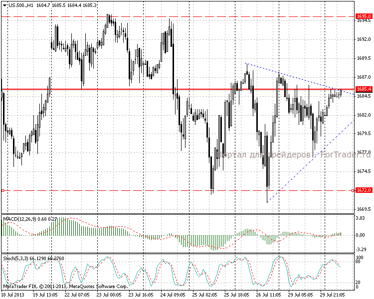 Участники рынка ждут очередного выступления главы ФРС, которое запланировано на завтра. Ожидается, что Бернанке подтвердит все сказанное ранее. Учитывая, что на часовом графике формируется алмазоподобная графическая формация, техническая картина свидетельствует скорее в пользу роста, чем падения. При пробое уровня 1685,5 следует ожидать подход цены к 1695,0.