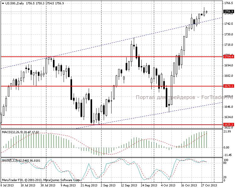 Экономические данные по США, вышедшие в понедельник, оказались разнонаправленными: промышленное производство за сентябрь отметилось ростом на 0,6% (прогноз +0,4%), в то же время продажи на вторичном рынке жилья упали на 5,6% (прогнозировался рост на 0,1%). Тем не менее, фондовый индекс уверенно торгуется выше уровня 1750,0. Сигналы о начале коррекции на дневном таймфрейме не определяются, несмотря на то, что стохастик на протяжении длительного срока пребывает в области перекупленности.