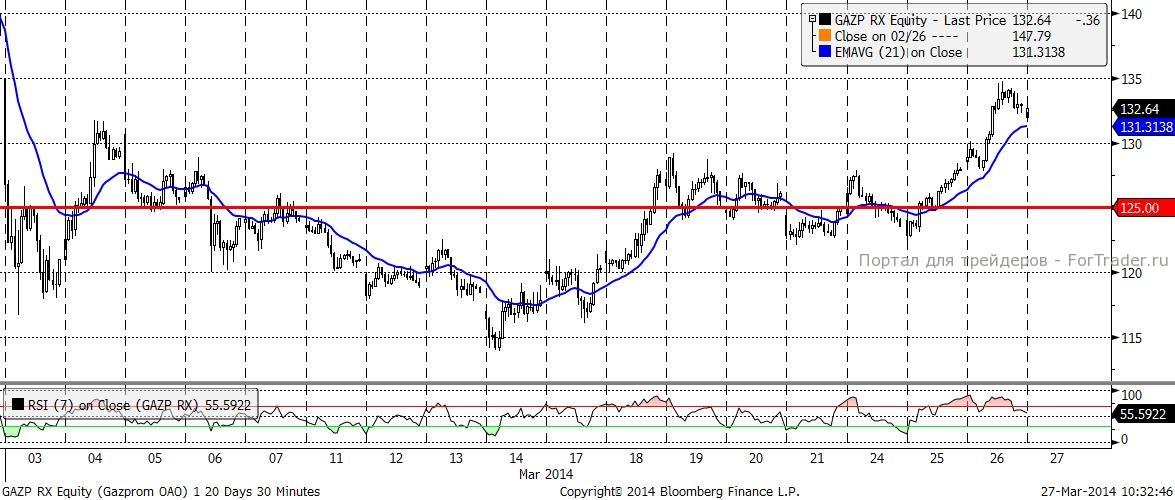 На наш взгляд, сейчас есть возможность небольшой коррекции по акциям Газпром, до уровней 125 – 130 рублей. В этом промежутке имеет смысл рассмотреть формирование длинных позиций.