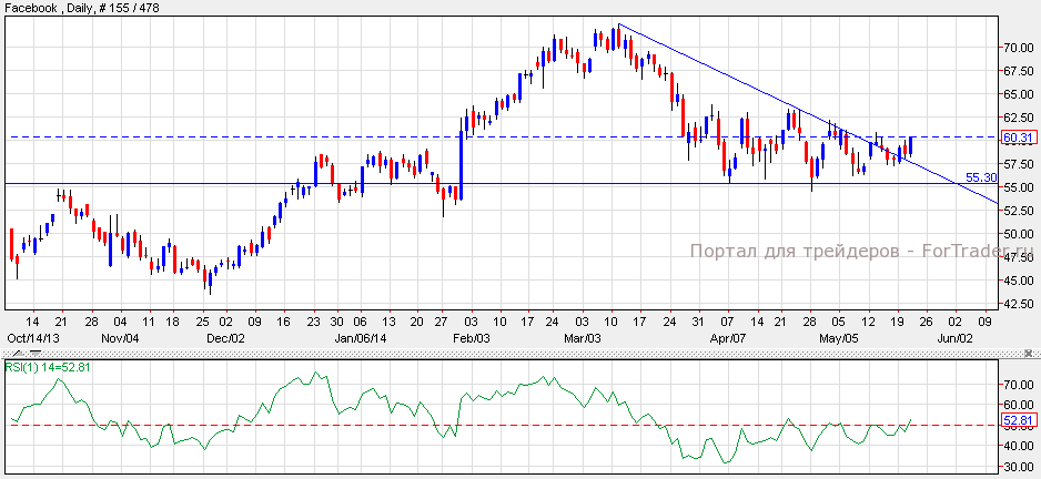 Акции Facebook взлетели на 30% и закрыли торги на цене $60.49, поскольку компания объявила о выпуске нового мобильного приложения. Это приложение определяет телевизионные программы и музыку играющую поблизости вашего телефона. Согласно техническому анализу дневного графика, цена акций пробила верхнюю линию «треугольника» с индикатором относительной силы выше уровня 50. Удерживая текущую динамику пара может вновь достичь отметки $62.50.