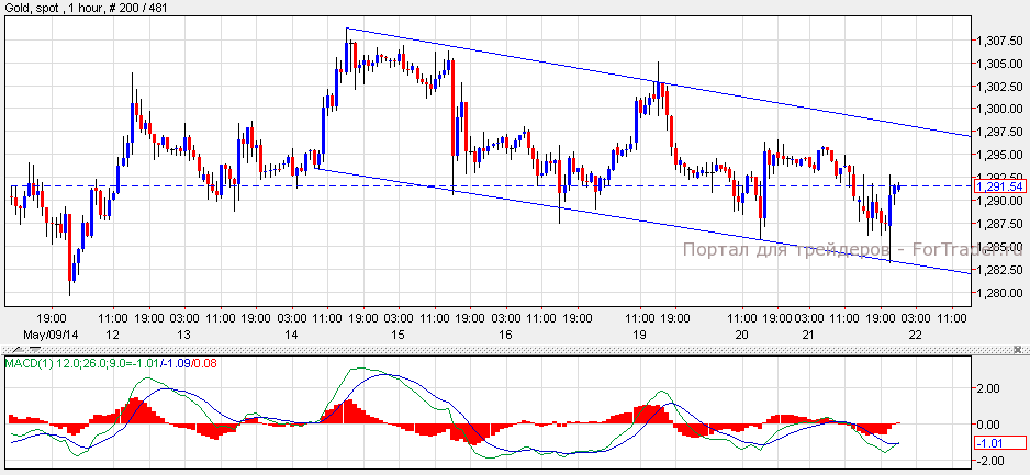 Золото подешевело на 0.22% и закрылось на цене $1292 за унцию. Согласно техническому анализу 1-часового графика, пока золото торгуется в нисходящем канале, котировки могут упасть к уровню $1,280. Однако, индикатор MACD формирует зону перепроданности, поэтому золото может вновь коснутся отметки $1,297 и протестировать верхнюю часть канала.