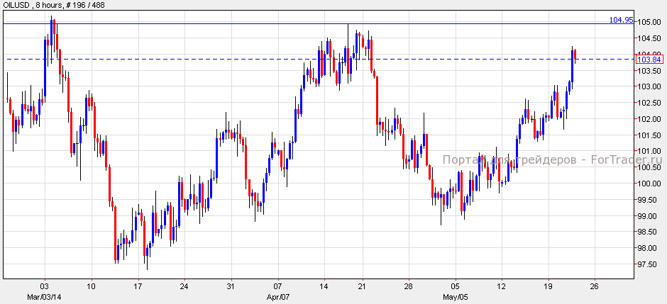 Нефть подорожала на 0.98% и закрылась на цене $103.88 за баррель, в результате выхода слабых запасов сырой нефти. Согласно техническому анализу 8-часового графика, черное золото торгуется с восходящим импульсом к уровню сопротивления $105.00. При порыве ниже уровня $103.00, нефть сформирует фигуру «чашка с ручкой» и упадет к уровню $102.50. Однако, пока нефть держится выше поддержки, возможен рост к отметке $104.00. При прорыве ниже поддержки, нефть упадет к уровню $101.00.