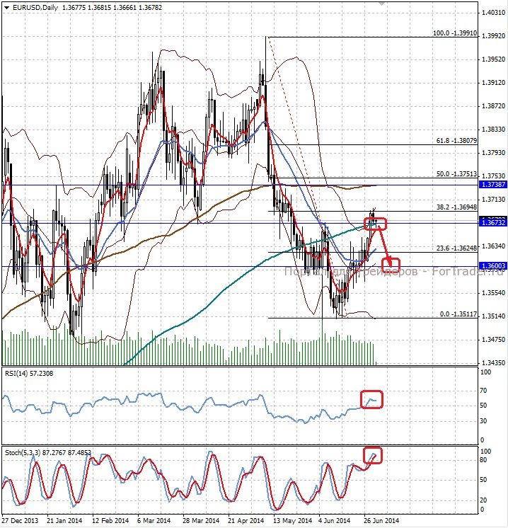 Пара евро/доллар торгуется у важного уровня 1.3672, который соответствует SMA 200 на дневном графике. Снижение ниже этого уровня на фоне хороших данных от ADP может привести к продолжению коррекционного движения вниз.