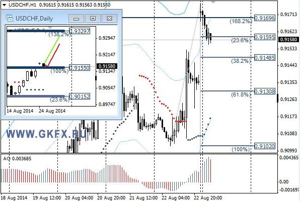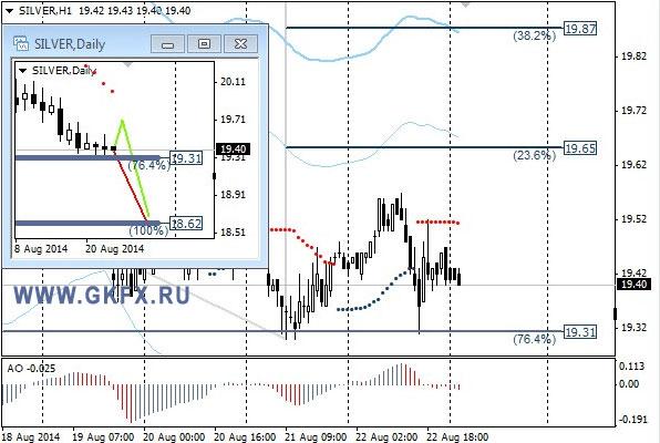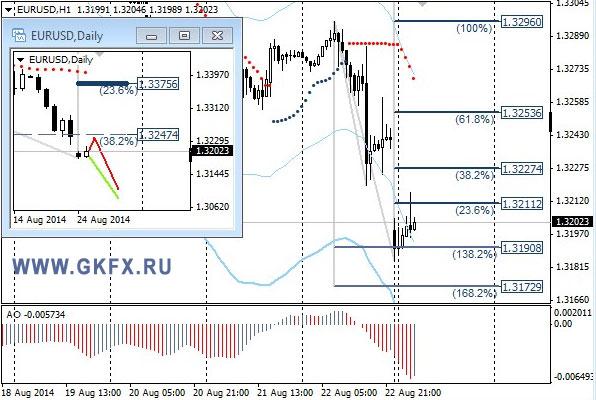 Пара EURUSD производила попытки ожидаемого роста на европейских торгах, но безуспешно. Тем не менее, по рекомендации сделка в покупки была исполнена по 1,3276 и первая цель была достигнута на уровне 1,3290. Это позволило стоп переместить на уровень безубытка, и в итоге он и сработал. На этой неделе можно ожидать дальнейшего роста доллара и снижения пары к новым минимумам за год. Выступление глав ЦБ Драги и Йеллен в Джексон Хоул способствовало продолжению роста доллара. Следовательно, на этой неделе такая динамика может продолжиться. На эту неделю традиционно рассматриваю два варианта возможного движения цены, основной красный и альтернативный зеленый. Значимые уровни на сегодня отмечены на часовом графике. Индикатор АО находится в отрицательной зоне и растет, указывая на коррекцию перед возможным продолжением снижения. Индикатор тренда указывает на снижение. Продажи от 1,3210/20 с целями 1,3190, 1,3175 и 1,3120. Стоп 1,3230.