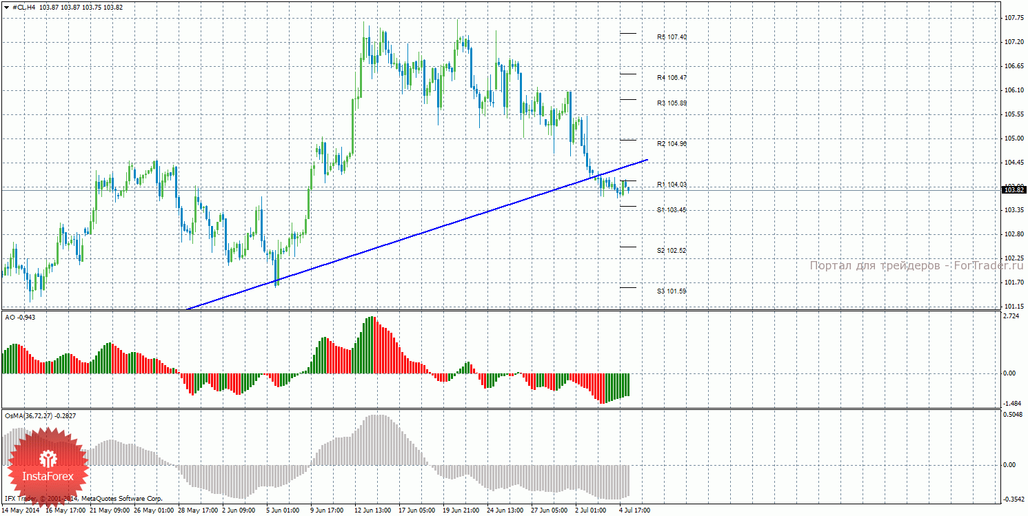 Анализ сырой нефти за 7 июля показывает, что цена закрепилась ниже восходящей линии тренда, поэтому тенденция на рынке поменялась на нисходящую. Нисходящее движение может продолжиться с целями S2 – 102,52 и S3 – 101,59, если цена закрепится ниже уровня 103,45. Может начаться виток восходящей коррекции с целями уровни сопротивления 104,96 и 105,89, если цена преодолеет уровень 104,03. Восходящая линия больше не поддерживает торгующих на повышение, цена закрепилась ниже нее, поэтому сейчас актуальны короткие позиции. Индикатор Awesome показывает текущее восходящее движение, так как последний закрытый бар зеленого цвета. OsMA также направлен наверх, что говорит о восходящем характере движения и в более долгосрочном плане. Оба индикатора сейчас разряжаются, так как цена не повышается.