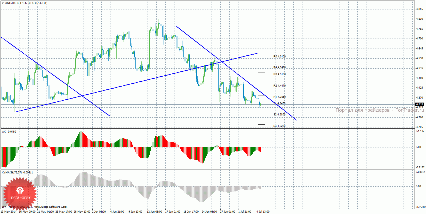 Анализ природного газа за 7 июля показывает, что цена продолжает нисходящий тренд, сформирована нисходящая линия тренда. На данный момент актуально нисходящее движение с целями уровни поддержки S2 – 4,2850 и S3 – 4,2220, если цена останется ниже уровня 4,3470. Целями для начала восходящей коррекции выступают уровни 4,3850 и 4,4470, если цена закрепится выше уровня 4,3470. Построена новая нисходящая линия тренда, которая оказывает поддержку торгующим на понижение и делает актуальными ордера на продажу. Индикатор Awesome показывает локальное нисходящее движение, последний закрытый бар окрашен в красный цвет. OsMA также развернулся вниз, что сигнализирует о нисходящем движении цены на газ и в более долгосрочной перспективе. Отскок цены от уровня 4,2850 может спровоцировать виток коррекционного движения.