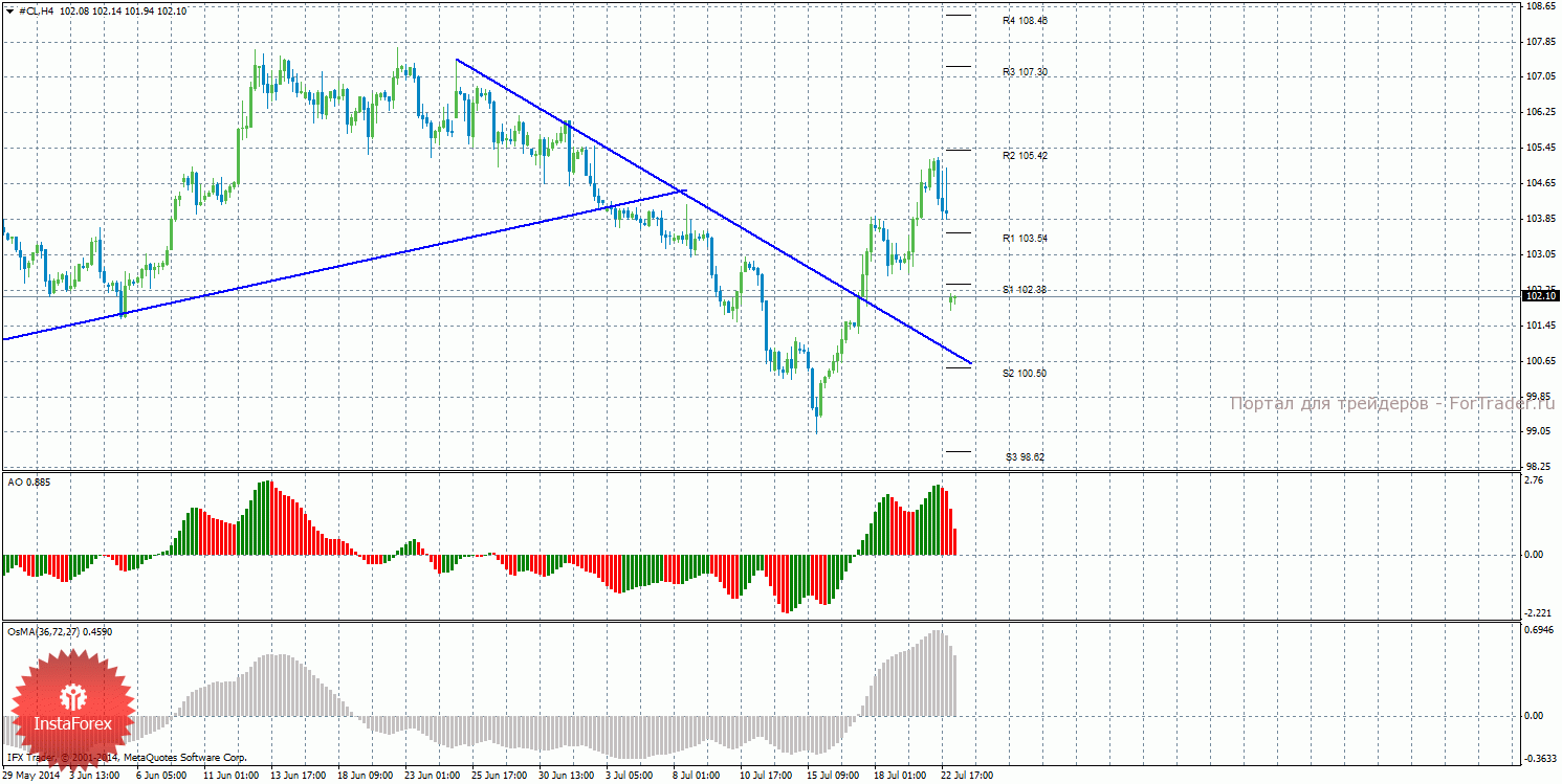 Анализ сырой нефти за 23 июля показывает, что цена начале резко корректироваться, оба индикатора развернулись вниз. Восходящее движение может возобновиться с целями уровни сопротивления R1 – 103,54 и R2 – 105,42, если цена закрепится выше уровня 102,38. Целями для нисходящей коррекции выступают уровни 100,50 и 98,62, если цена останется ниже уровня 102,38. Цена закрепилась выше нисходящей линии тренда, поэтому тенденция на рынке поменялась на восходящую и стали актуальными ордера на покупку. Восходящей линии тренда пока что нет. Индикатор Awesome показывает текущее нисходящее движение, так как последний закрытый бар красного цвета. OsMA также развернулся вниз, что говорит о нисходящем характере движения и в более долгосрочном плане. Если цена закрепится выше уровня 102,38, это может спровоцировать возобновление восходящего движения.