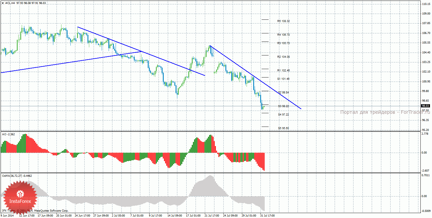 Анализ сырой нефти за 1 августа показывает, что цена продолжает нисходящее движение, построена новая нисходящая линия тренда. Нисходящее движение может продолжиться с целями уровни поддержки S4 – 97,22 и S5 – 95,60, если цена останется ниже уровня 98,22. Целями для витка восходящей коррекции выступают уровни 99,84 и 101,46, если цена закрепится выше уровня 98,22. На данный момент построена новая нисходящая линия тренда, тенденция на рынке поменялась на нисходящую и вновь актуальны ордера на продажу. Индикатор Awesome показывает текущее нисходящее движение, так как последний закрытый бар красного цвета. OsMA также направлен вниз, что говорит о нисходящем характере движения и в более долгосрочном плане. Оба индикатора могут начать разряжаться в любой момент. Если цена отскочит от уровня 97,22, это может спровоцировать начало коррекционного движения.