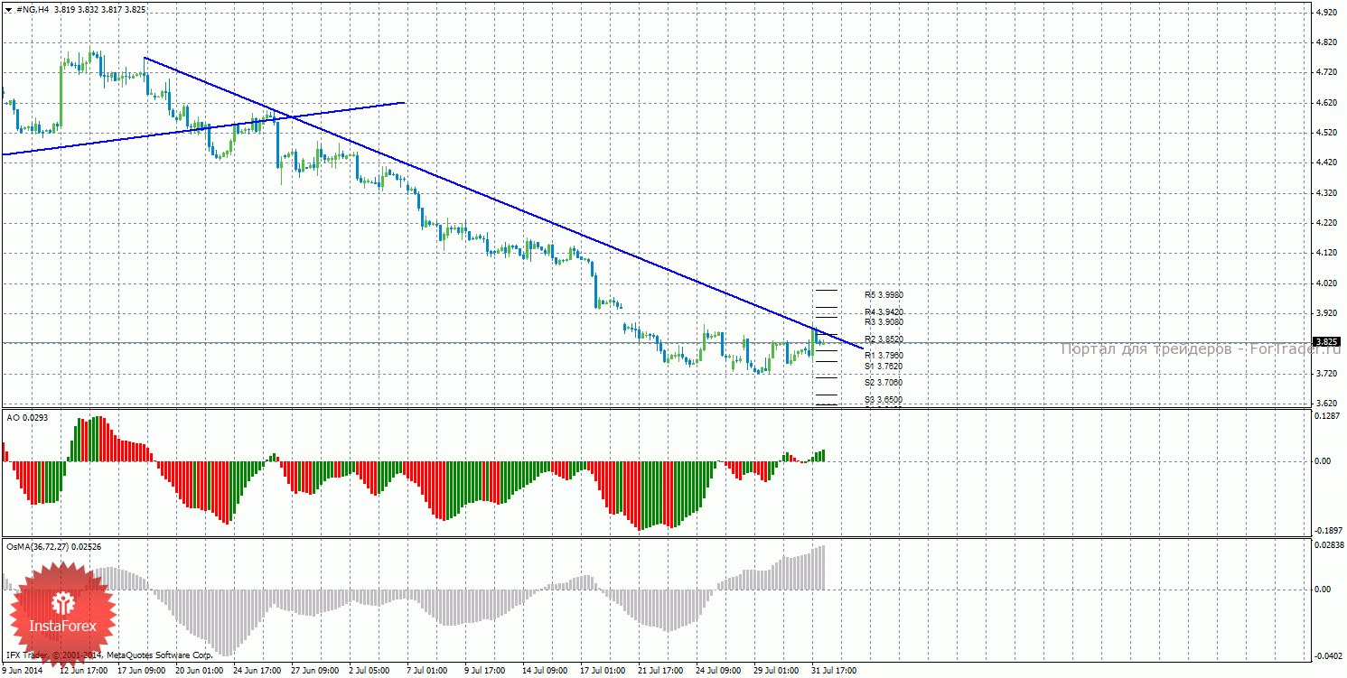 Анализ природного газа за 1 августа показывает, что цена продолжает коррекционное движение и отработала нисходящую линию тренда. На данный момент актуально нисходящее движение с целями уровни поддержки S1 –3,7620 и S2 – 3,7060, если цена отскочит от линии тренда. Целями для продолжения восходящего движения выступают уровни 3,9080 и 3,9420, если цена закрепится выше линии тренда. Нисходящая линия тренда оказывает поддержку торгующим на понижение и делает актуальными ордера на продажу. Если цена закрепится выше линии тренда, то тенденция на рынке поменяется на восходящую и станут актуальными длинные позиции. Индикатор Awesome показывает локальное восходящее движение, последний закрытый бар окрашен в зеленый цвет. OsMA также направлен наверх, что сигнализирует о восходящем движении цены на газ и в более долгосрочной перспективе. Отскок от линии тренда может спровоцировать завершение коррекционного движения.