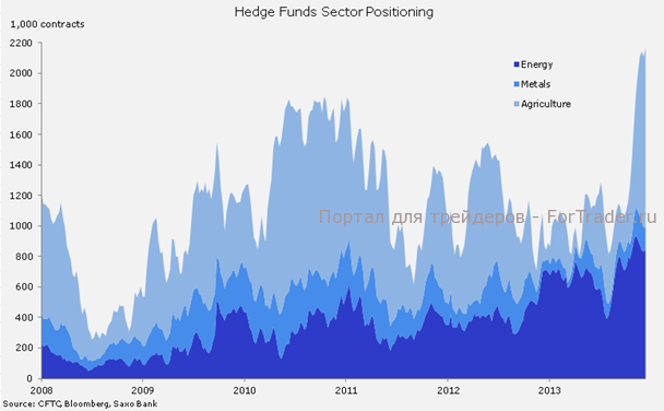 Интерес инвесторов к вложениям в сырьевые активы остается высоким, спрос возобновился после мартовской коррекции. В результате больше всех выиграли энергетический и сельскохозяйственный секторы. Общая чистая длинная позиция на основании вложений хедж-фондов и инвестиционных менеджеров во фьючерсы и опционы по 24 сырьевым инструментам, торгуемым на американской бирже, увеличилась до рекордно высокого значения и составила 2,164,000 контрактов, что в денежном эквиваленте равно 131,4 млрд долларов. Чистую короткую позицию в настоящий момент можно найти только на рынке меди. Инвестиции в сельскохозяйственные инструменты, а именно кукурузу, пшеницу, живой скот и скот, откармливаемый на убой, достигли максимальных уровней как минимум за 12 месяцев.