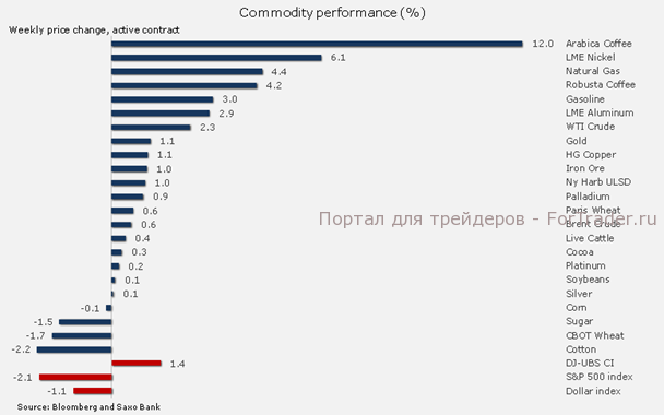 Сырьевой рынок продолжил рост третью неделю подряд, двигаясь обратно нисходящему тренду на фондовом рынке. Среди основных движущих факторов можно выделить: падение курса доллара, настроенную на сохранение мягких условий ФРС США, а также геополитические проблемы и погодные условия. Повышение цен наблюдалось во всех секторах, в особенности на рынке промышленных металлов, где высокие результаты показали никель и алюминий. Энергетический сектор улучшил позиции благодаря бензину и нефти сорта WTI, в то время как сельскохозяйственный сектор получил поддержку в виде роста цен на кофе.
