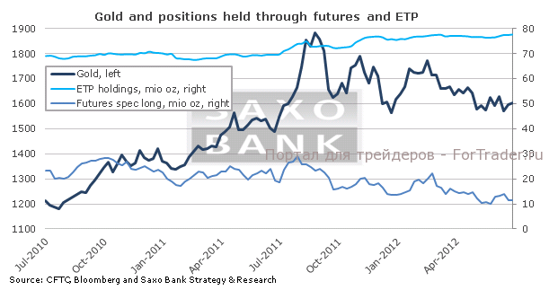 Между тем, спекулятивные инвесторы, в частности, хеджевые фонды, настроены менее решительно: с августа 2011 года они сократили свои позиции с 25,6 млн. унций до 11,6 млн. унций. На графике ниже хорошо видно, что последние годы два типа инвестиционных инструментов ведут себя совершенно по-разному.