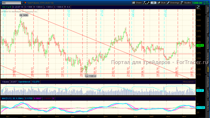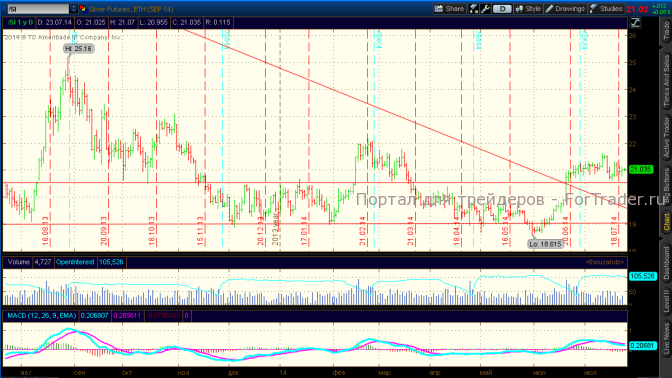 Сегодня золото и серебро подрастают в рамках текущих диапазонов консолидации, а платиноиды снижаются. Курс доллара США слегка снижается после вчерашнего роста. Статистические данные по инфляции в США в июне 2014 г. показали рост цен на 2% в годовом выражении, розничные продажи выросли меньше, чем в мае 2014 г.