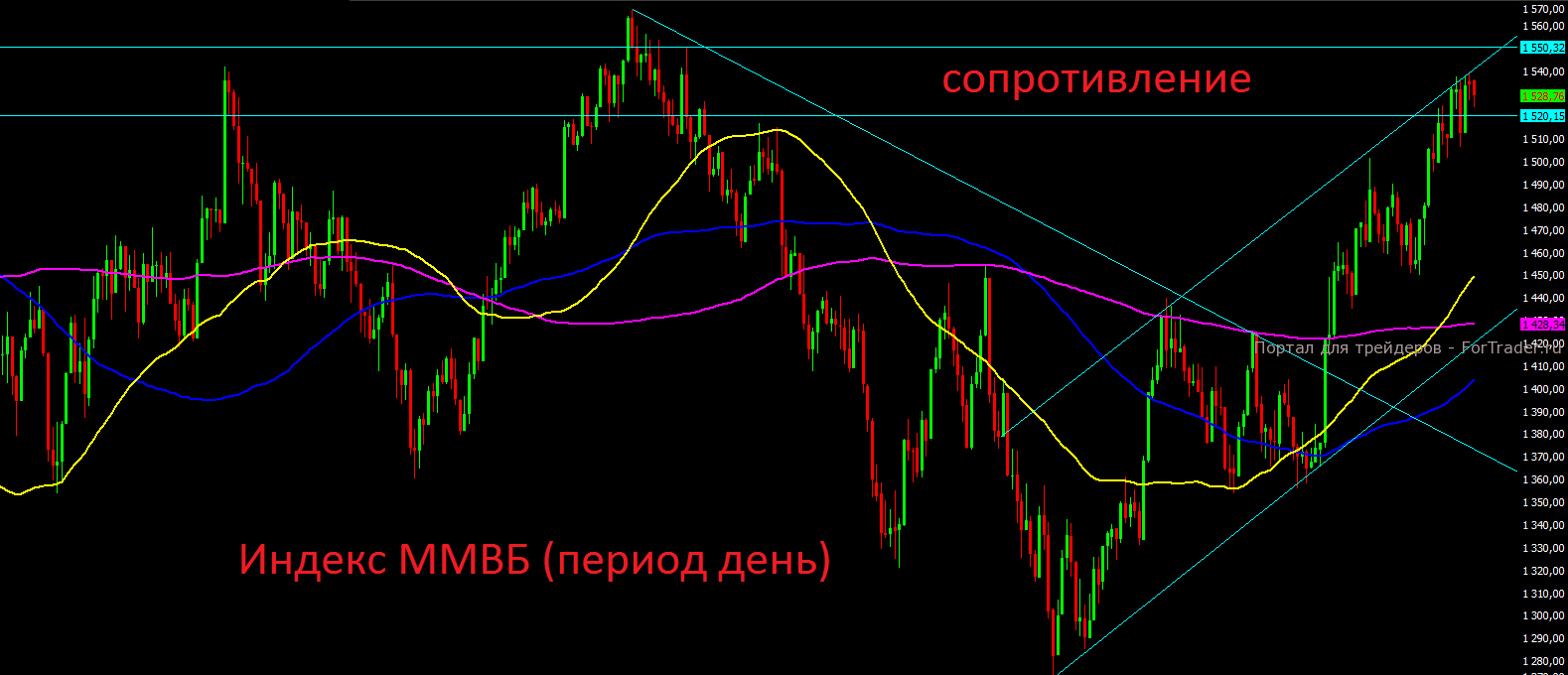 С технической точки зрения прекрасно видно как цена продолжает отбиваться от верхней границы восходящего канала и при закрытии любого дня ниже отметки 1510 пунктов созреют все предпосылки для коррекционного движения вниз в пределах 5% к нижней границе канала. Под давлением последние два дня находится именно нефтегазовый сектор в России на фоне укрепления рубля и снижения цен на нефть и если у продавцов дойдут руки и до акций Сбербанка, что скорее всего и случится сегодня, то движение вниз может ускориться.