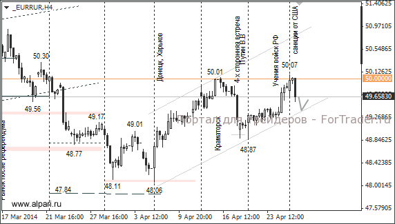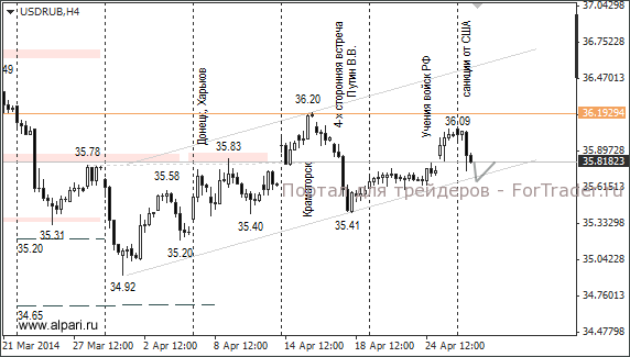 Если ситуация на востоке Украины днём не ухудшится, то внимание участников рынка сфокусируется на выходе инфляционного отчета в Германии (16:00 мск) и предварительных данных по изменению ВВП Великобритании за I квартал (12:30 мск). В случае сильного отклонения фактических значений от прогнозных, оба отчёта могут оказать сильное влияние на евро и фунт.