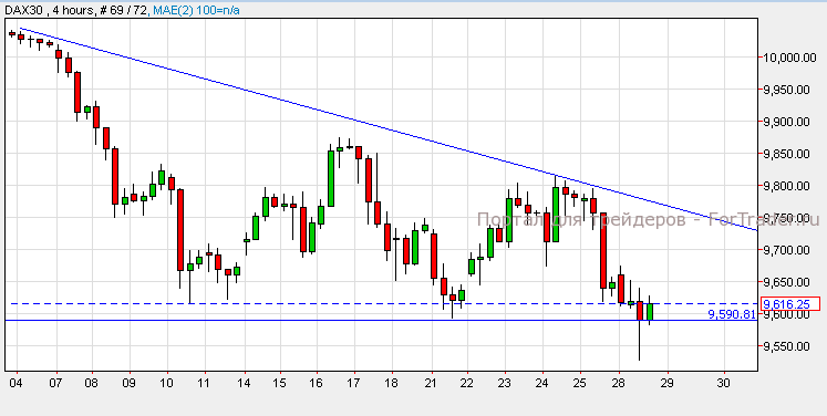 Немецкий индекс DAX 30 сформировал фигуру «нисходящий треугольник» после вчерашней задержки выше уровня поддержки 9,590. Прорыв ниже уровня поддержки приведет индекс к отметке 9,500, а задержка выше вызовет рост к отметке 9,740. Сегодня состоится публикация индекса цен на импорт в Германии, поэтому рынок может стать более волатилен.