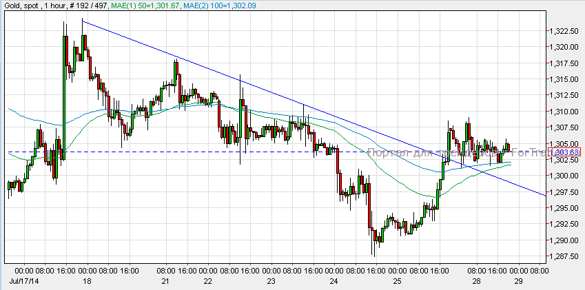 Золото подешевело на 2 доллара и закрыло торги на отметке $1,303. Согласно техническому анализу 1-часового графика, золото продолжает торговаться выше уровня поддержки и выше 50 и 100-дневных скользящих средних. Пока золото торгуется выше отметки $1,296, возможно продолжение восходящего импульса.