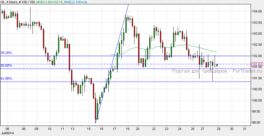 Нефть подешевела и закрылась на отметке $101.60, после выхода слабых экономических данных в США. Согласно техническому анализу 4-часового графика, нефть удерживается выше 50%-ного уровня коррекции Фибоначчи и может вырасти к отметке $102. Прорыв данного уровня приведет нефть к отметке $103. Если черное золото опустится ниже уровня коррекции, возможно его падение к отметке$100.70.