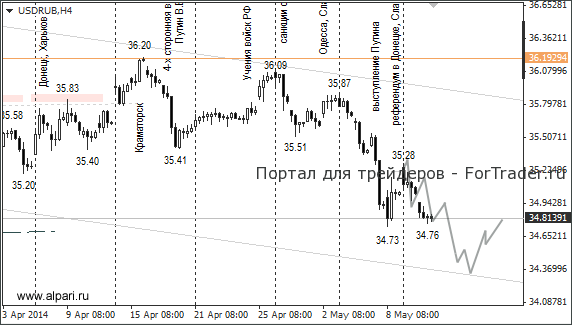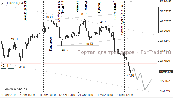 Инвесторы игнорируют события на Украине, продолжают выкупать российскую валюту. Курс евро/рубль закрепился ниже отметки 48,12 (минимум от 01.04.2014) и 50%-го уровня от роста с января текущего года на фоне падения евро на рынке Форекс. Это сигнализирует о готовящемся падении курса евро/рубль до следующей цели 46,80. Курс доллар/рубль вернулся к уровню 34,75 и держит курс на 34,20/15. Вполне могут успеть снизиться к указанным уровням до президентских выборов на Украине (25 мая).