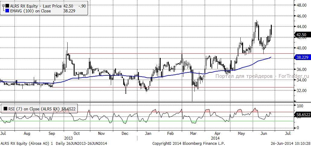 С технической точки зрения очень интересно выглядит график акций Алроса. Очевидно, что цена вышла из среднесрочного бокового коридора и имеет все основания для дальнейшего роста.