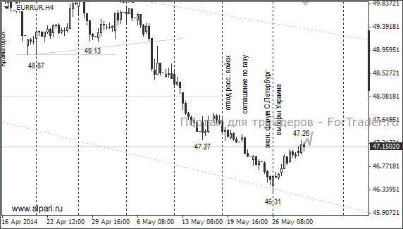 Рубль остаётся под давлением и по итогам четверга незначительно снизился против доллара и евро. Газовый долг не погашен. Также не решён вопрос с поставками российского газа Украине в июне. Новоизбранный президент Пётр Порошенко вчера заявил, что Украина не будет закупать газ у России по цене 500 (Порошенко округлил 485,5) долларов и готова отказаться от него в пользу реверсных поставок из Европы и сжиженного топлива из США. Эксперты сходятся во мнении, что Европа не сможет обеспечить топливом украинский энергетический рынок, а значит, вопрос придётся решать.
