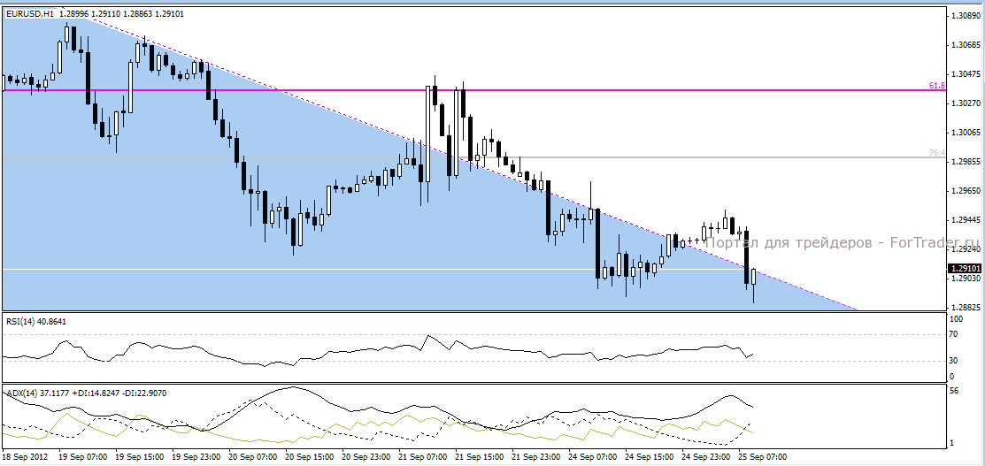 Трендовый индикатор среднего направленного движения (ADX) с периодом 14 опять спасовал перед отметкой 40 пунктов на графике с шагом час. В силу этого рост единой европейской валюты откладывается. Осциллятор относительной силы (RSI) далёк от перепроданности ровно настолько, чтобы дать евро упасть к 1,282.