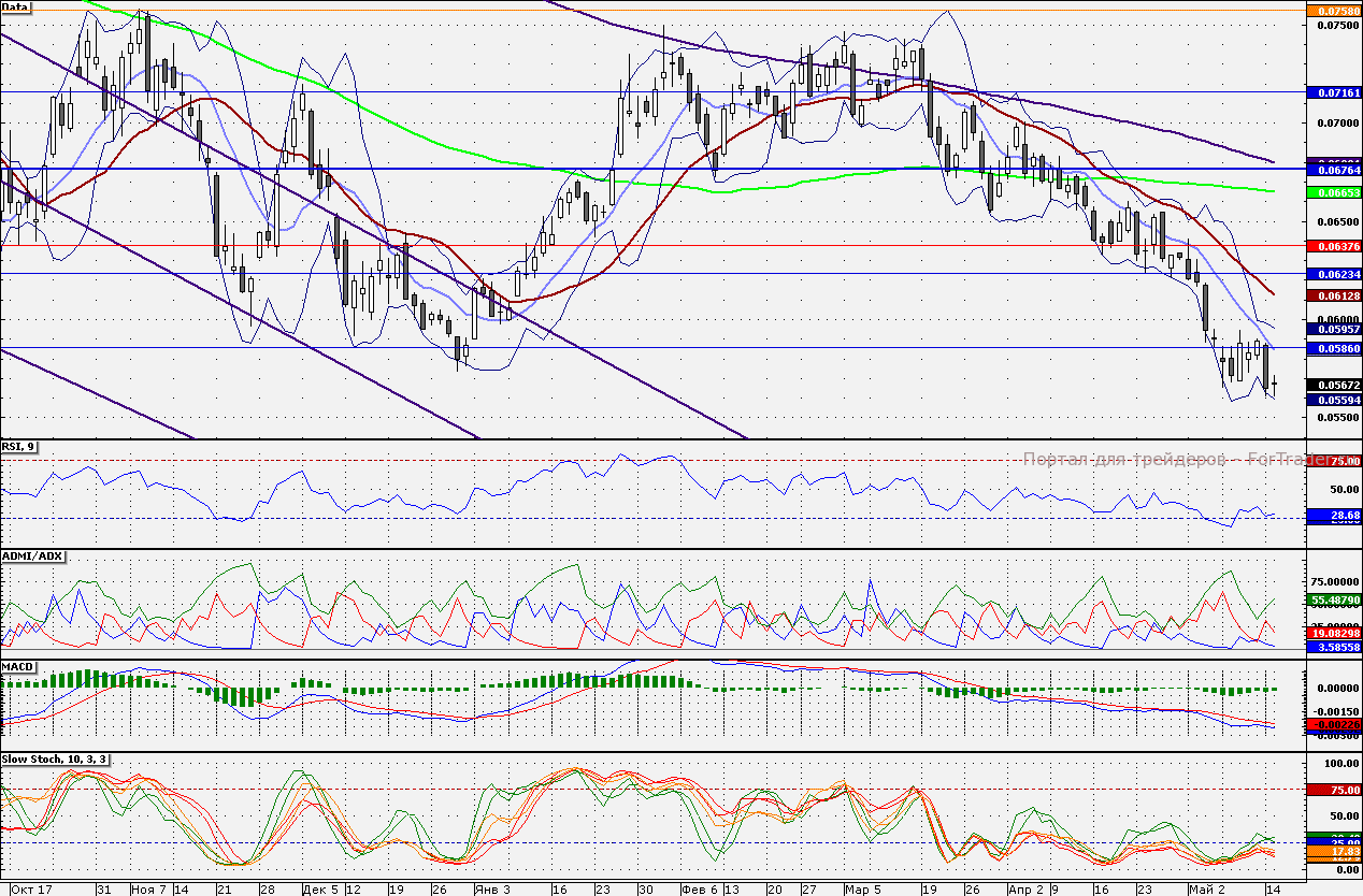 Акции ВТБ вернулись к годовому минимуму, который располагается на отметке 5,604 коп. Данный уровень является поддержкой и сегодня. В случае сильных распродаж акции могут уйти к 5,500 коп. Сопротивлением является 10-дневная скользящая средняя 5,847 коп., от данной отметки «лонги» стоит сокращать.