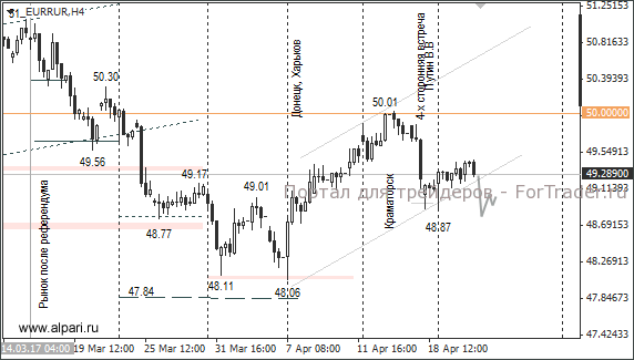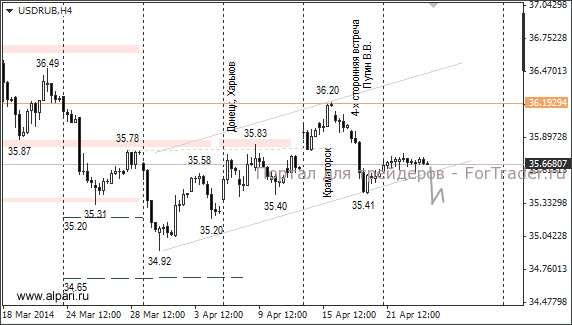Техническая картина на четырёхчасовом тайм-фрейме благоприятна для покупок рубля. Спекулянты просто обязаны воспользоваться этой возможностью. Если ситуация на Украине не усугубится, то к закрытию торговой сессии курс доллар снизится до 35,30, курс евро до 48,70 руб.