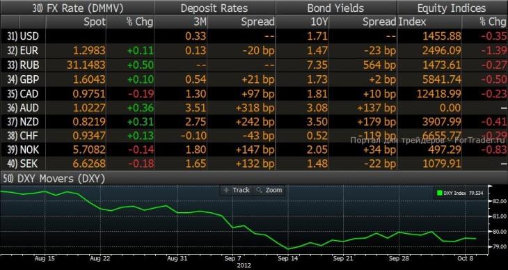 Торги в понедельник, 8 октября, завершились для рынков снижением ведущих фондовых индексов. Американские индексы просели в пределах процента (NASDAQ Composite -0,76%), европейские – в пределах полутора (CAC 40 -1,46%, DAX -1,44%). Российские индексы не стали счастливым исключением: РТС снизился до 1 492,51 пункта (-1,07%), ММВБ — до 1 473,61 пункта (-0,27%). Негативом для рынка стало ухудшение прогнозов Всемирного банка по экономическому росту стран Азии, а также неопределенность в отношении ситуации в Европе (8-9 октября в Люксембурге проходит встреча министров финансов стран зоны евро). На объединенной бирже росли в цене акции «Газпромнефти» (+0,12%), «Полюс Золота» (+0,29%), «Сургутнефтегаза» (+0,79%), «ФСК ЕЭС» (+1,83%). Снижались котировки ВТБ (-0,73%), «Газпрома» (-0,11%), «ЛУКОЙЛА» (-0,08%), «Норникеля» (-0,93%), «Роснефти» (-0,17%), «Ростелекома» (-1,04%), Сбербанка России (-0,45% и -0,10% «префы»), «Татнефти» (-1,35%).
